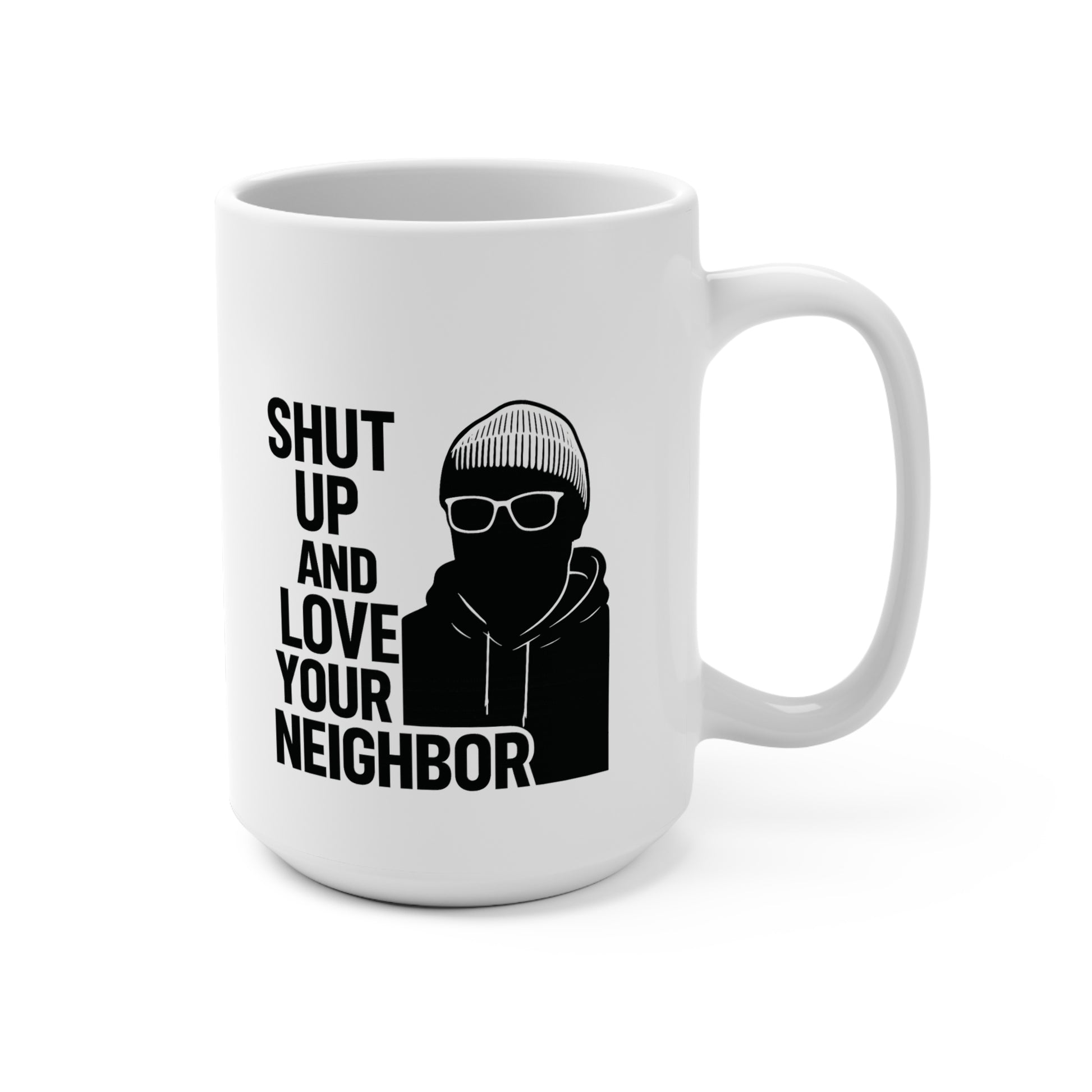 A bold, minimalist white ceramic mug that speaks quietly but clearly. The clean 15oz silhouette holds a generous pour of coffee, tea, or whatever fuels your mornings. Front and center sits a stark black illustration of a bundled figure and block-letter message that reads like a gentle dare: “Shut up and love your neighbor.” The matte-white canvas and high-contrast print make the design feel modern and slightly subversive — the kind of object that starts conversations over slow mornings, shared kitchens, or late-night study sessions. It settles easily into an apartment full of plants, a busy office desk, or a volunteer’s break room. Durable and practical, it stands up to daily life without fuss, so the message can keep doing its small work, one cup at a time.